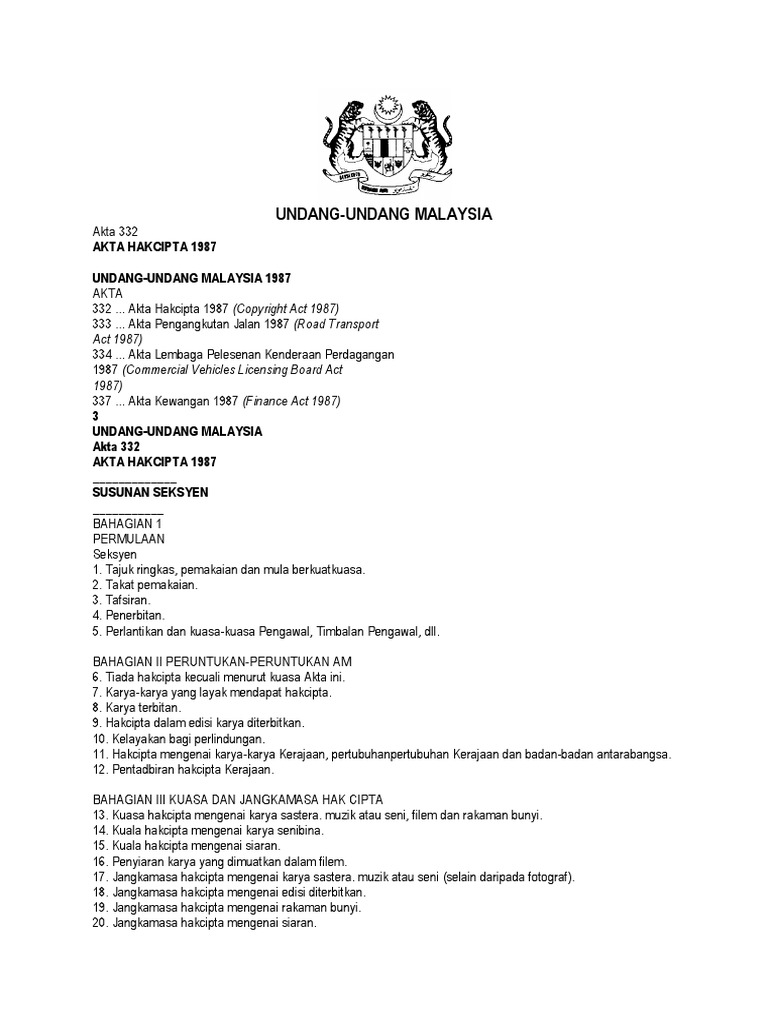 Home akta hak cipta in the national language a translation of a literary work regulations repealed by p u a. Hak cipta 3 undang undang malaysia akta 332 akta hak cipta 1987 susunan seksyen ba h a g i a n i permulaan seksyen 1. Tiada hak cipta kecuali menurut kuasa akta ini 7. Akta hakcipta 1987 pdf you are here.