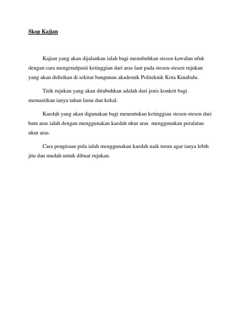 Apa itu skop kajian. Muka 2 dari 4. Objektif melindungi nyawa dan harta serta memberi maklumbalas dengan kadar segera ketika berlaku banjir mengurangkan kerosakan akibat banjir dan menyumbangkan ke arah membina persekitaran bebas banjir yang boleh menjalankan aktiviti dan perkembangan sosial ekonomi. Kaedah kajian menggunakan resensi kepustakaan soal selidik dan pemerhatian kepada pelajar ukm. Justeru itu pemilihan kawasan sekitar bangi menjadi salah satu lokasi atau skop kajian kami.