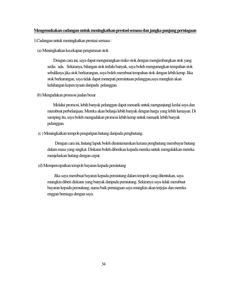Peniaga boleh membuka cawangan di tempat lain sama ada di bandar atau daerah lain. Cadangan untuk meningkatkan prestasi jangka panjang perniagaan. Program bimbingan perniagaan dan pemantapan dapat meningkatkan potensi keusahawanan peniaga. Saya juga boleh membuat kajian yang lebih jelas dan menentukan strategi yang boleh diambil untuk meningkatkan prestasi perniagaan saya.