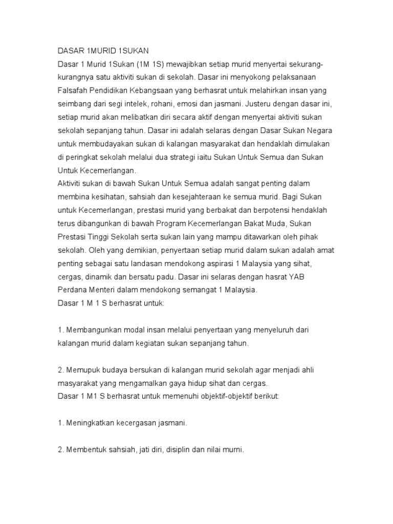 Dasar 1 murid 1 sukan telah dilaksanakan di semua peringkat pendidikan sama ada di sekolah rendah sekolah menengah mahupun di peringkat latihan perguruan seperti institut pendidikan guru ipg. Dasar ini membolehkan murid yang menceburkan diri secara serius dalam bidang sukan itu dapat mengharumkan nama sekolah. Dasar 1 murid 1sukan 1m 1s mewajibkan setiap murid menyertai sekurang kurangnya satu aktiviti sukan di sekolah. Karangan stpm manfaat dasar 1 murid 1 sukan dasar 1 murid 1sukan 1m 1s mewajibkan setiap murid menyertai sekurang kurangnya satu aktiviti sukan di sekolah.