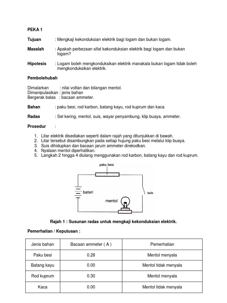 Eksperimen logam dan bukan logam. Soalan 1 rajah 1 1 dan rajah 1 2 menunjukkan satu eksperimen untuk mengkaji kekonduksian haba antara logam dan bukan logam jadual menunjukkan masa yang diambil untuk paku tekan jatuh selepas kedua dua rod dipanaskan a nyatakan satu hipotesis untuk eksperimen ini. Logam bukan logam unsur dapat dikelaskan kepada logam bukan logam contoh logam ialah besi aluminium zink kuprum plumbum timah dan emas contoh bukan logam ialah karbon iodin bromin sulfur fosforus dan klorin semua logam wujud sebagai pepejal kecuali mekuri raksa cecair bukan logam boleh wujud dalam keadaan pepejal cecair atau gas pada suhu bilik panitia. Antara barangan yang diperbuat daripada logam ialah periuk kuali sudu pisau dan sebagainya. Beberapa dari jenis logam ini telah disebutkan dimana termasuk logam yang banyak dan umum digunakan baik secara murni maupun sebagai unsur paduan.