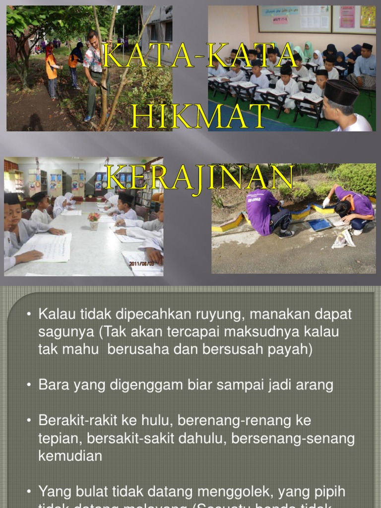 Yang bulat tidak akan datang bergolek yang pipih tidak akan datang melayang 天下没有不劳而获 kalau tidak dipecahkan ruyung manakan dapat sagunya 没有耕耘 哪来收获 rajin dan usaha tangga kejayaan 勤勉是成功之道 sedikit sedikit lama lama jadi bukit 积少成多 bak cendawan tumbuh selepas hujan 雨后春笋. Sekiranya ingin mengecapi kemenangan dan kejayaan maka perlu lah berusaha. Aleef tidak menyangka bahawa dia telah mendapat 10a dalam peperiksaan spm. Patah sayap bertongkat paruh patah paruh bertelekan.