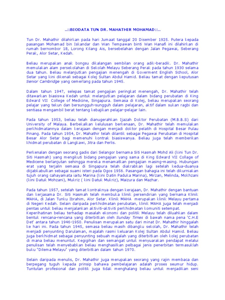 Dr Mahathir Latar Belakang Tun Dr Mahathir Bin Mohamad Yang Juga Digelar Sebagai Dr M Dan Nama Penanya Che Det Dilahirkan Pada 20 Disember 1925 Di Course Hero
