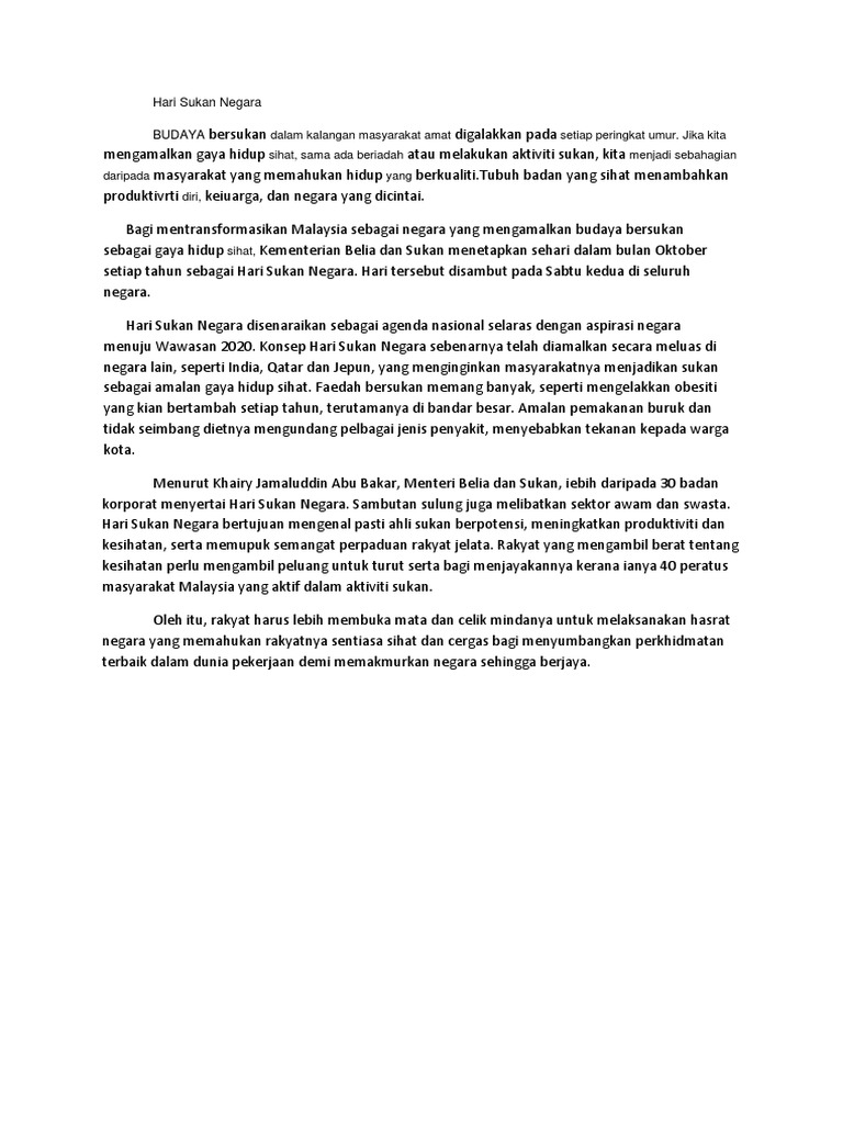 Karangan hari sukan negara. Tiada halangan untuk kita bersukan pada hari ini kerana banyak infrastruktur sukan yang lengkap dan boleh digunakan samada di waktu siang atau malam. Oleh yang demikian hari sukan negara di jadikan agenda nasional yang selari dengan matlamat negara ke arah wawasan 2020. Hari sukan negara 2020. Pada tahun 2016 ini sambutan hari sukan negara bakal diisi dengan pelbagai aktiviti sukan dan riadah untuk memastikan setiap lapisan masyarakat mengambil bahagian dalam meraikan sambutan hari sukan negara tersebut yang akan diraikan secara serentak di seluruh pelusuk tanah.