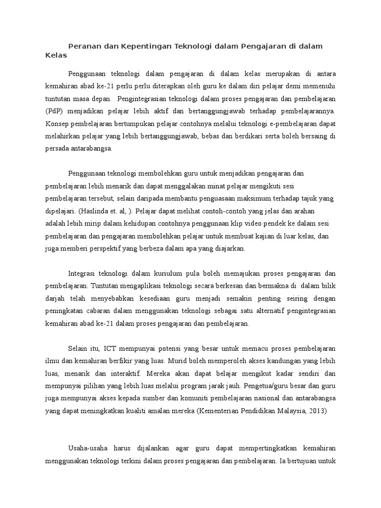 Peranan teknologi dalam pendidikan penggunaan ict dalam proses pengajaran dan pembelajaran banyak memberi kesan yang baik kepada murid murid khususnya yang di sekolah rendah. Tidak dapat dinafikan lagi bahawa teknologi atau sesuatu alat bantu mengajar dalam bahasa sememangnya dapat membantu pencapaian pelajar menguasai aspek bahasa dengan lebih baik dowling 1999. Peranan teknologi pendidikan dalam pdp penggunaan ict dalam proses pengajaran dan pembelajaran banyak memberi kesan yang baik kepada murid murid khususnya yang di sekolah rendah. Dalam keghairahan mengguna teknologi maklumat dalam pendidikan kita harus berwaspada terhadap bahaya dan kesan negatif akibat penggunaan yang tidak terkawal.