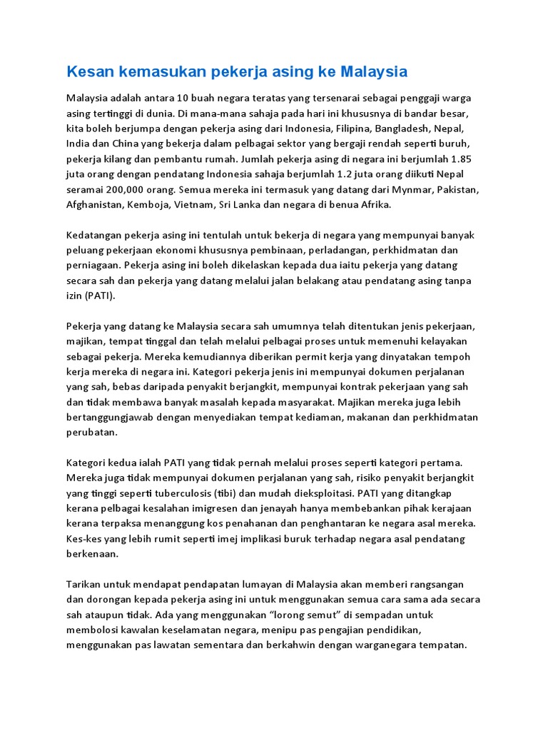 Kesan Kemasukan Pekerja Asing Ke Malaysia Karangan