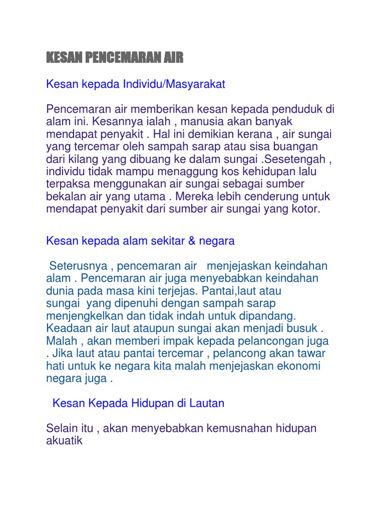 Kesan pencemaran air terhadap hidupan laut. Sebagai contoh kesan yang dianggap kronik akibat pencemaran air yang berlaku terhadap manusia ialah anomalia iaitu pembesaran tubuh dan tingkah laku yang tidak normal serta kurang daya ketahanan badan akibat penggunaan sumber air tersebut. Sebagai contoh hampir 78 penyu yang mati adalah disebabkan tertelan plastik atau sisa buangan manusia kerana dianggap makanan oleh mereka. Pencemaran air akan memberi kesan kepada kesihatan menusia. Oleh itu kemusnahan dan pencemaran sungai akan menjejaskan sumber protein kepada rakyat keseluruhannya.