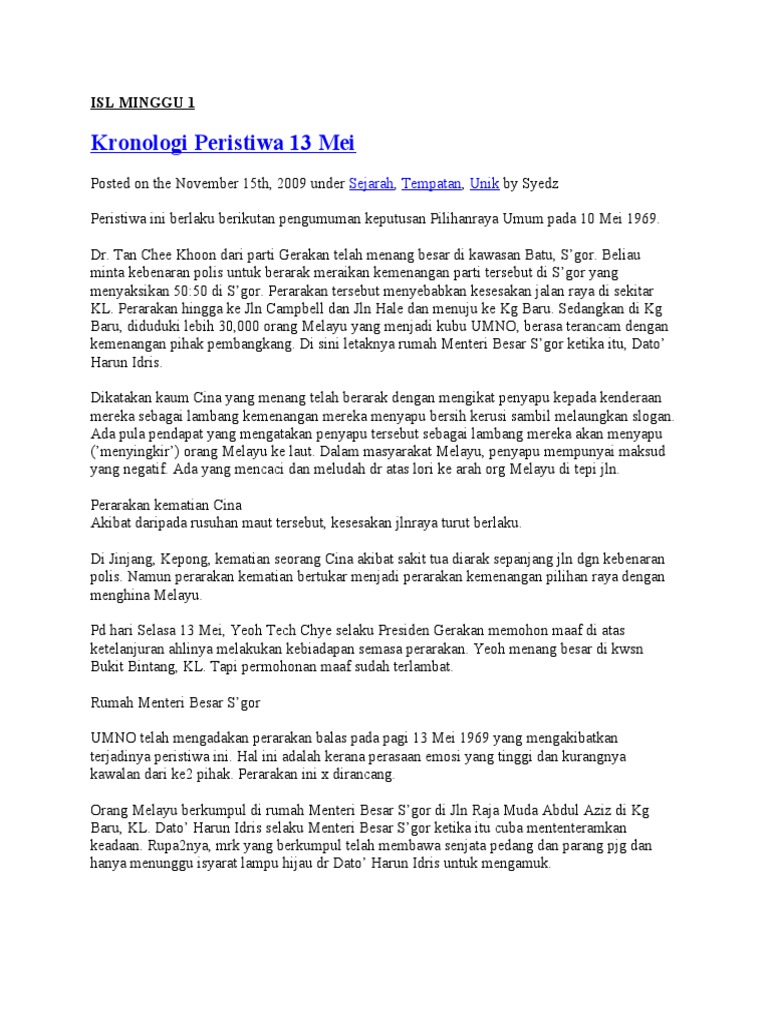 Kronologi peristiwa 13 mei 1969. Ia lebih dikenali sebagai peristiwa 13 mei 1969. Tragedi ini yang mengakibatkan kehilangan nyawa serta harta benda dan mempunyai kaitan yang rapat dengan pilihan raya umum 1969 merupakan satu titik hitam dalam sejarah negara malaysia. Mereka umpama harimau lapar menunggu mangsanya alpa. Unknown selasa 7 oktober 2014.