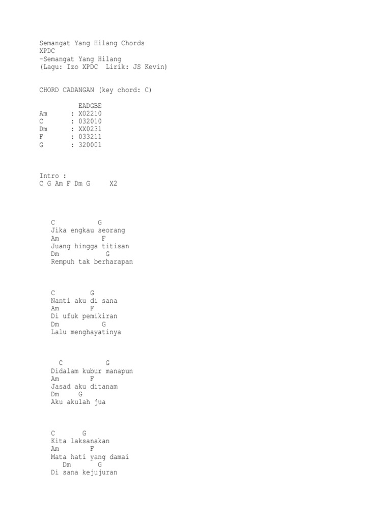 C g am f dm g x2 c g jika engkau seorang am f juang hingga titisan dm g rempuh tak berharapan c g nanti aku di sana am f di ufuk pemikiran dm g lalu menghayatinya c g didalam kubur manapun am f jasad aku ditanam dm g aku akulah jua c. Lirik semangat yang hilang oleh xpdc. Semarak impian segunung harap dipulang usahlah diragukan keupayaan sendiri hati yang membara mengikutkan kata apa jawapannya di sini semangat kita yang hilang. Xpdc semangat yang hilang chord artist.