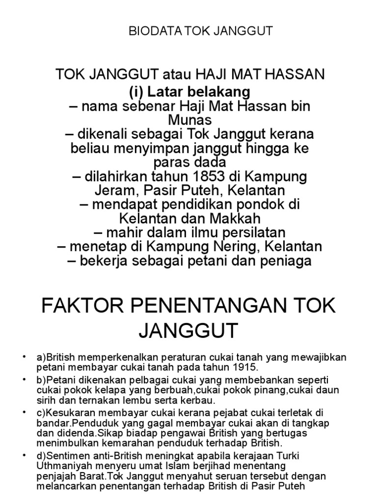 Latar belakang tok janggut. Perang tok janggut adalah detik awal penentangan terhadap sistem pentadbiran british di kelantan. Beliau dilahirkan pada tahun 1853 di kampung jeram pasir puteh kelantan. Tok janggut tok janggut atau haji mat hassan i latar belakang nama sebenar haji mat hassan bin munas dikenali sebagai tok janggut kerana beliau menyimpan janggut hingga ke paras dada dilahirkan tahun 1853 di kampung jeram pasir puteh kelantan mendapat pendidikan pondok di kelantan dan makkah mahir dalam ilmu persilatan. Haji hassan bin panglima mat munas yang lebih dikenali sebagai tok janggut kerana memelihara janggut sampai ke paras dada.