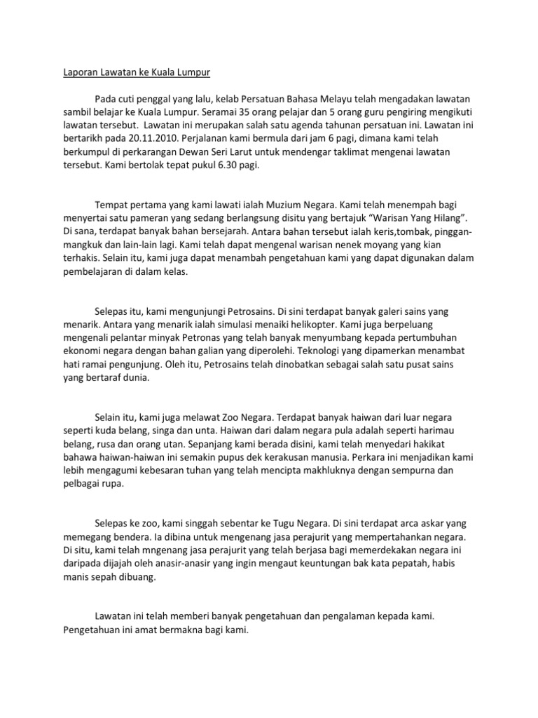 Lawatan ini bertujuan untuk memberi pendedahan kepada murid tentang tempat tempat menarik yang terdapat di sekitar kuala lumpur dan jenis jenis pengangkutan awam yang terdapat di sana. Pada hari sabtu 15 september 2012 yang lalu jk lawatan sjk t ladang senama telah mengadakan lawatan sambil belajar ke kuala lumpur. Rombongan yang diketuai oleh cikgu zulkifli dan beberapa orang guru termasuk cikgu fadzlina cikgu mustaqim cikgu izwan cikgu oh dan cikgu shah bersama sama murid murid tiba di tempat penginapan di kompleks belia dan sukan air keruh melaka kira kira jam 10 00 mlm. Karangan laporan lawatan sambil belajar laporan sambil belajar ke bangunan parlimen pada 5 mei 2013 yang lalu seramai 35 pelajar daripada persatuan sejarah sekolah menengah kebangsaan st.