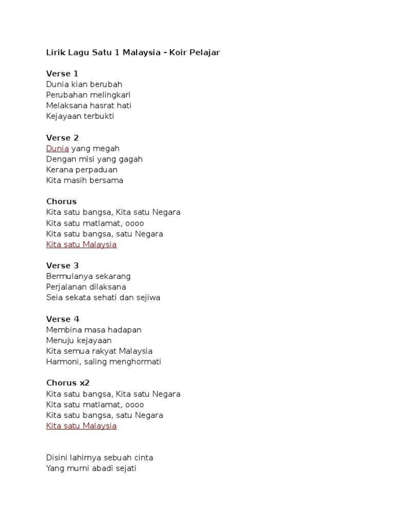 Lirik Lagu Satu 1 Malaysia Koir Pelajar Verse 1 Dunia