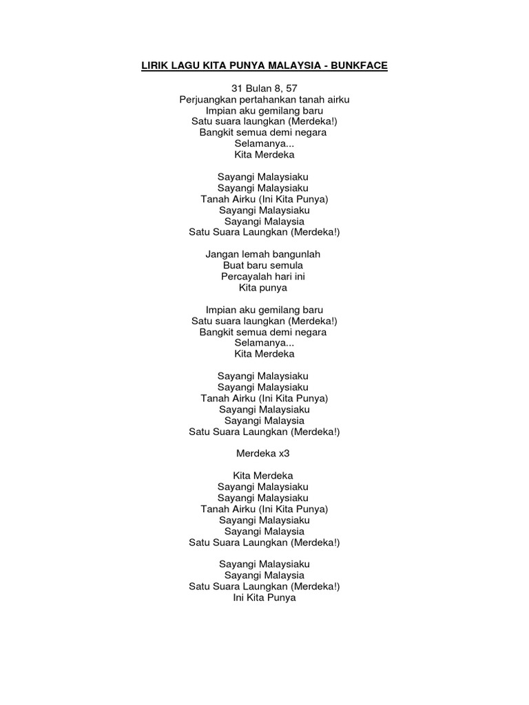 Lirik lagu sayangi malaysiaku bunkface. Sam bunkface 31 bulan 8 57. Lyrics for kita punya malaysia by bunkface. 31 bulan 8 57 perjuangkan pertahankan tanah airku impian aku gemilang baru satu suara lau. Download lirik lagu sini kita punya malaysia lirik lagu kita punya malaysia bunkface 31 bulan 8 57 perjuangkan pertahankan tanah airku impian aku gemilang baru satu suara laungkan merdeka bangkit semua demi negara selamanya.