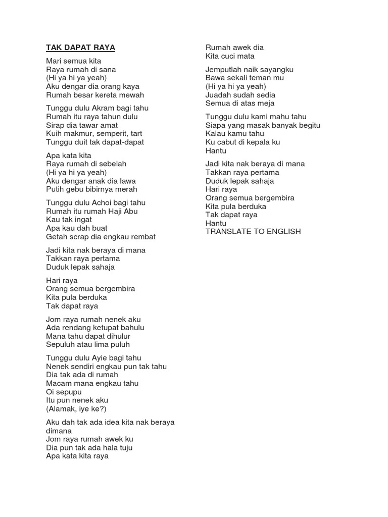 Lirik lagu tak dapat raya. Lirik lagu tak dapat raya lagi muncul kembali oleh kumpulan floor 88 dan baby shima dengan lagu hari raya. Raya rumah di sana hi ya hi ya yeah aku dengar dia orang kaya. Lagu kali ni kena tengok muzik video baru datang feel kalau dengar lagu sahaja macam tak berapa nak go. Tak dapat raya penyanyi.