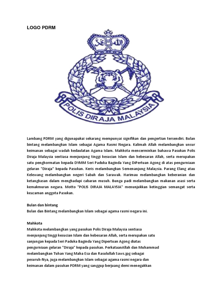 Maksud logo polis diraja malaysia. Bunga padi melambangkan makanan asasi rakyat malaysia serta kemakmuran negara. Setiap cabang atm ada polis sendiri. Walaupun di bawah cabang tentera darat malaysia tugasnya meliputi ketiga tiga cabang atm. Rmp at rmp dot gov dot my bantuan portal peta laman dasar privasi dasar keselamatan notis hakcipta penafian hakcipta terpelihara pdrm 2016.