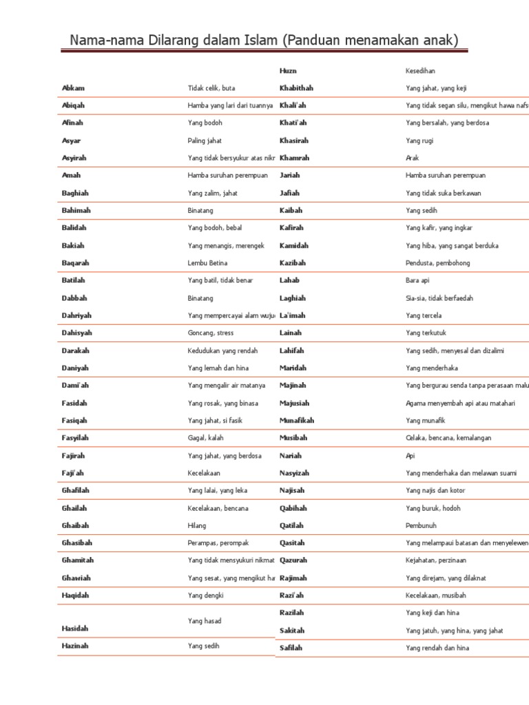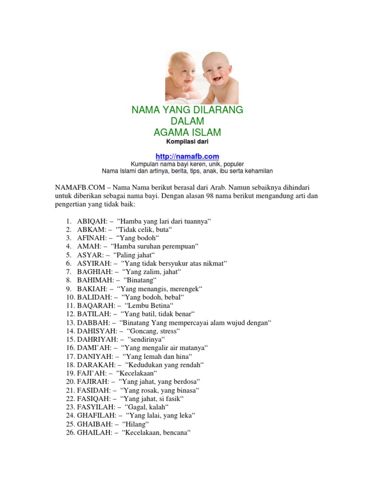 Nama nama yang dilarang dalam islam. Berikut adalah sebahagian daripada nama nama lain dalam islam yang harus dielakkan dan dihindari bagi menamakan bayi anda. Nama nama yang dilarang dalam islam perantau selasa mei 28 2013. A abiqah hamba yang lari dari tuannya abkam tidak celik buta afinah yang bodoh amah hamba. Nama yang dimaksud juga bisa membawa arti pesimis atau karakteristik tercela yang akan dibenci atau menyebabkan kebencian.