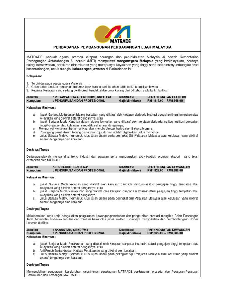 Pegawai hal ehwal ekonomi matrade. Berikut merupakan maklumat iklan kerja kosong yang ditawarkan oleh majikan terlibat. Last updated jul 30 2020. Pegawai ehwal ekonomi gred e41 2 kekosongan merancang strategi pengurusan perancangan restructuring dan pemantauan organisasi dari aspek struktur organisasi skim perkhidmatan perjawatan pengauditan iso pengurusan perkhidmatan dan perjawatan pegawai dan kakitangan matrade. Senarai tugas gaji dan syarat lantikan.