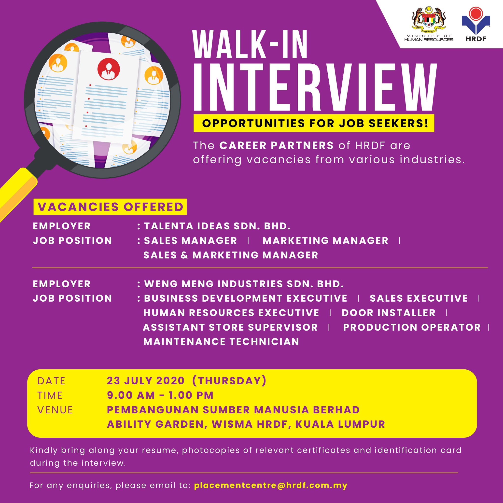 Hrdf Human Resources Development Fund On Twitter More Jobs Opportunities Walk In Interview With Career Partners Of Hrdf On 23 July 2020 At Wisma Hrdf Kuala Lumpur Register Online To Pre Book Your