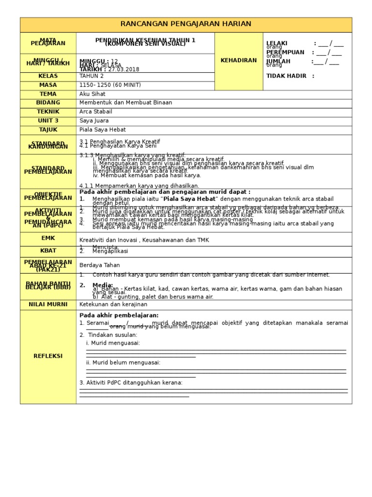 Kurikulum seni visual untuk sekolah rendah mengandungi empat bidang iaitu menggambar membuat corak dan rekaan membentuk dan membuat binaan serta mengenal kraf tradisional. Rph dsv tahun 2 minggu 4. Sk rpt dunia visual tahun 2 2017 versi 2. Tahun 2 pendidikan kesihatan.