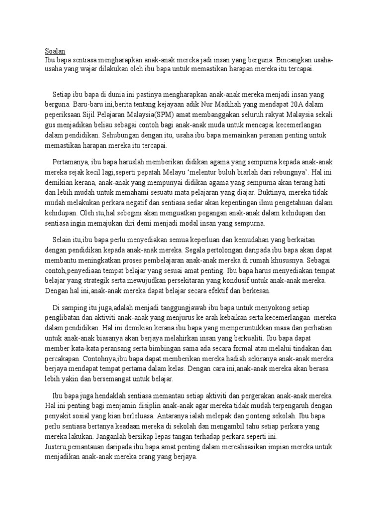 Oleh itu ibu bapa memainkan peranan yang amat penting dalam melahirkan modal insan yang cemerlang dan sempurna dari segi jasmani身体 rohani精神 emosi mental心智 dan intelek智力. 4 0 peranan ibu bapa dalam melahirkan modal insan yang cemerlang 4 1 ibu bapa menjadi contoh teladan yang baik sebelum anak bersekolah ahli keluarga adalah individu yang paling dekat dengan anak anak. Peranan ibu bapa melahirkan anak yang cemerlang jawapan penyemak soalan anak merupakan satu anugerah tuhan kepada mana mana ibu bapapun. Corak yang dihasilkan itu bakal menentukan siapakah anak anak pada masa hadapan ibu bapa sentiasa mengharapkan dan mendambakan anak anak mereka menjadi insan yang berguna serta berbakti terhadap orang tua.