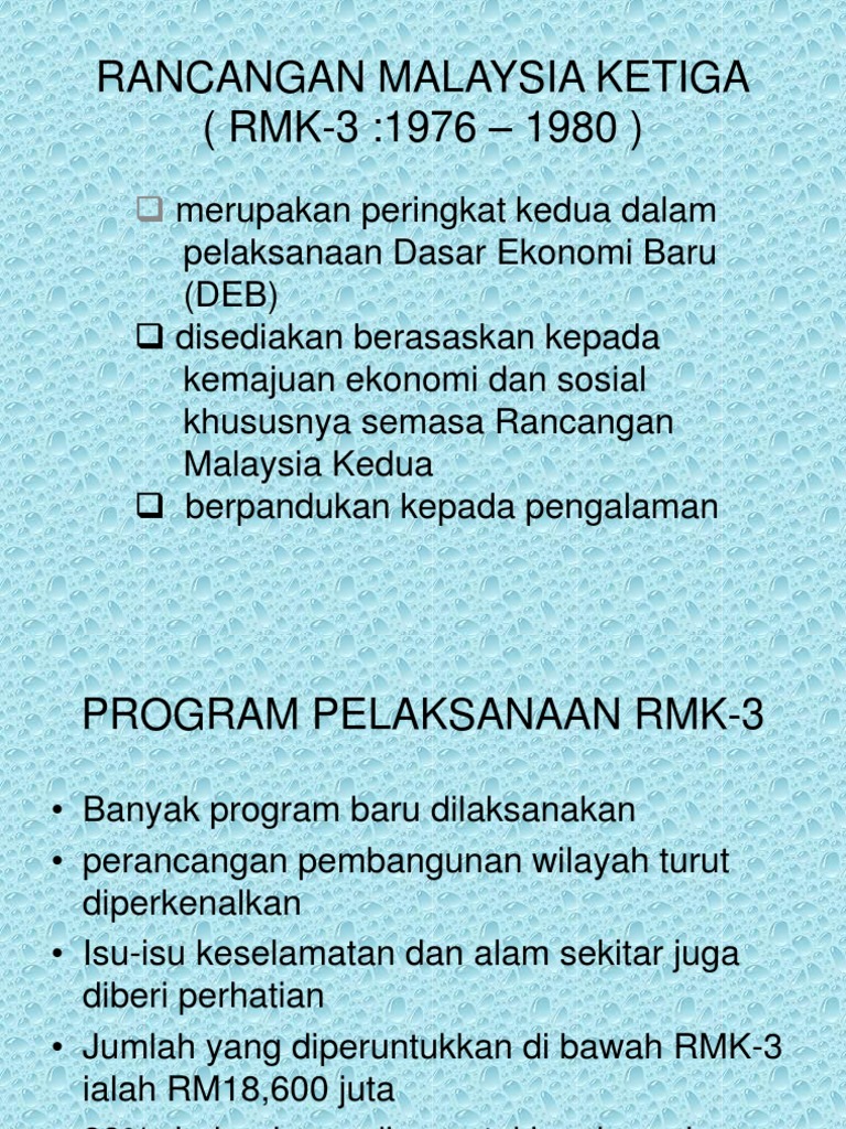 Rancangan malaysia ke 3. Rmk3 masih memberi tumpuan kepada bidang pertanian yang dilihat sebagai salah satu cara untuk merapatkan jurang ekonomi penduduk luar bandar dan penduduk bandar. Rfn ke 3 ini juga menekankan kepada pembangunan dan perancangan yang mampan sebagai prinsip utama dalam mencapai sebuah negara yang berdaya tahan dan berdaya huni pada tahun 2040. Bank negara malaysia mengeluarkan 3 jenis duit syiling peringatan sempena memperingati pelancaran rancangan malaysia ke 3 oleh perdana menteri malaysia yang ke 2 tun abdul razak. Berikut adalah ringkasan daripada inti pati utama rancangan malaysia ke 11 rmk11 2016 2020 yang dibentangkan oleh perdana menteri datuk seri najib razak di dewan rakyat pada 21 mei 2015.