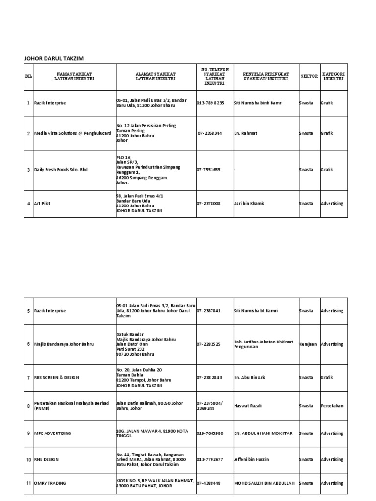 Senarai syarikat di johor bahru. Mendapat surat lantikan atau sijil pendaftaran utiliti daripada suruhanjaya yang berkaitan. Johor bahru 81100 johor 87227 k. Mestilah sebuah syarikat penyedia utiliti yang berdaftar di malaysia. Tidak disenaraihitam oleh mana mana suruhanjaya utiliti.