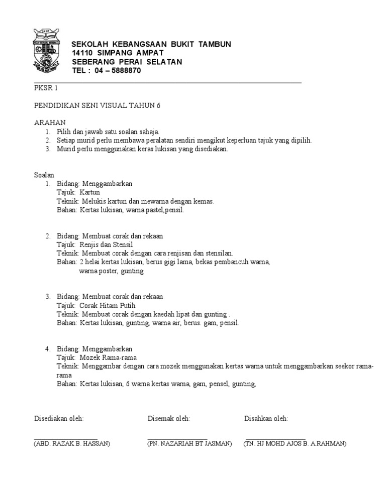 Soalan akhir tahun pendidikan seni visual tahun 6 adalah antara bahan bahan terbaik yang kami ada bahan yang terdapat di sini memenuhi keperluan pentaksiran berasaskan sekolah yang dilaksanakan secara menyeluruh mengikut prinsip bahawa semua mata pelajaran yang terkandung dalam kssr memainkan peranan yang penting bagi memenuhi keperluan jasmani rohani emosi dan intelek untuk membantu.