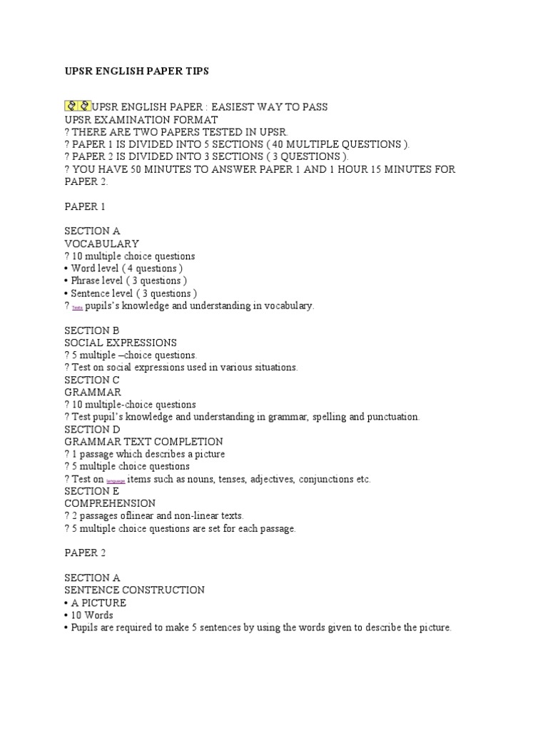 Section a sentence construction in this section of the upsr paper 2 one picture and ten words are given to test your proficiency in writing with the correct usage of grammar and spelling. Section a section b and section c. In upsr 2016 there will be another paper english paper 2 which requires candidates to write two essays section b and section c. You may use the words inthe boxes to help you.